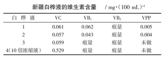 相关研究显示,桦树汁中 VB1含量0.004~0.007 mg/L,VB2含量0.095~0.105 mg/L, VC含量0.25~5.00 mg/L, VE含量0.001~0.005 mg/L。有专家对新疆布尔津平原林场春采白桦液的维生素含量进行分析,得出如下数据。