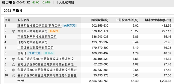 据格力电器2024年三季报显示,董明珠持有格力电器股份超过1亿股,占总股本的1.79%,参考市值约48.32亿元。