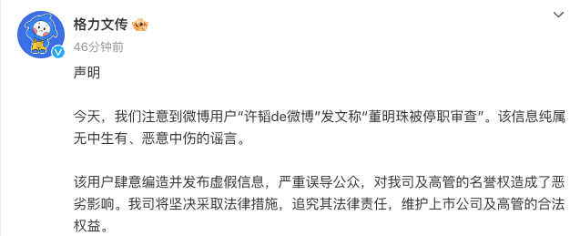 格力文传称,该用户肆意编造并发布虚假信息,严重误导公众,对格力公司及高管的名誉权造成了恶劣影响。格力将坚决采取法律措施,追究其法律责任,维护上市公司及高管的合法权益。