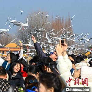 1月17日,游客在昆明海埂大坝与红嘴鸥互动。中新网记者 李嘉娴 摄