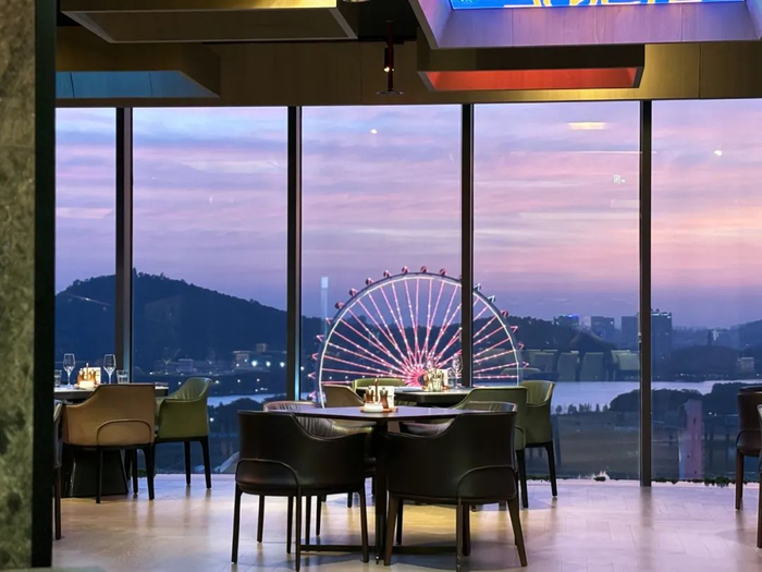 顺德欢乐海岸岭南花园酒店位于顺德欢乐海岸PLUS内,杏荟餐厅位于酒店17层,无敌高空景观,纵览欢乐海岸全景,辅以中西融合的高端创新珍馐美馔,在极佳高空景观下得到更加丰富的品尝体验。