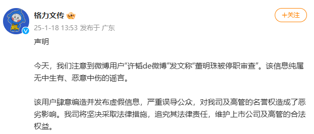 珠海格力电器股份有限公司文化传媒中心微博1月18日发布声明: