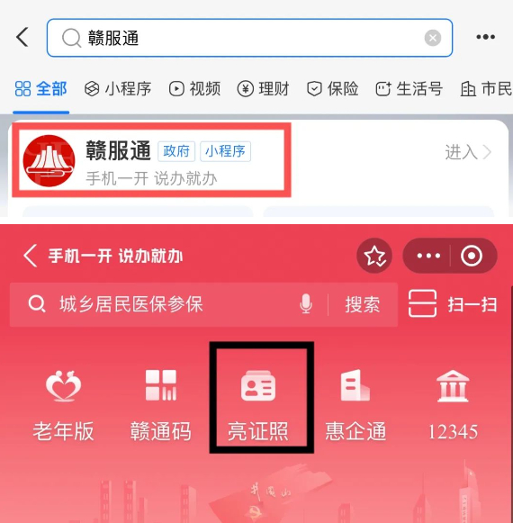 1.支付宝搜索“赣服通”→点击“亮证照”。