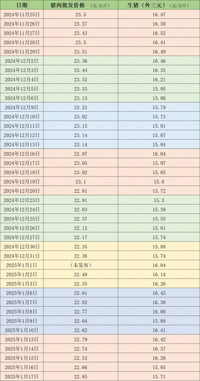 据农业农村部监测,1月17日,全国农产品批发市场猪肉平均价格为22.85元/公斤,与上周五(1月10日)的22.62元/公斤相比,上涨1%。本周的平均价格为22.71元/公斤,与上周22.73元/公斤的均价相比,基本持平。