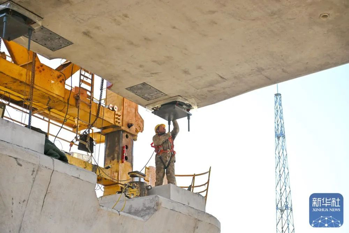 1月16日,中铁十一局集团工人在雄商高铁站前六标段最后一孔箱梁架设现场作业。