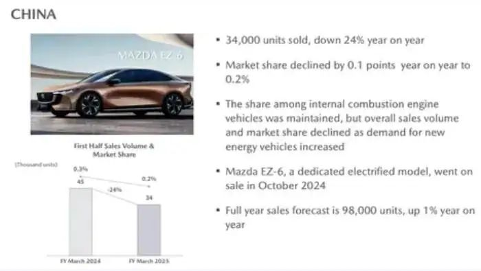 马自达在财报中还表示,中国市场上半年(4-9月)销量同比下滑24%,主要原因是深受新能源汽车发展及价格战的影响。
