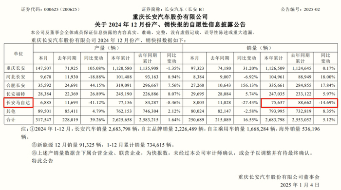 然而,1月4日,长安汽车(000625.SZ)对外披露的产销快报数据显示,长安马自达2024年累计销量为75637辆,而2023年同期销量为88662辆,同比下降14.69%。即相比于2023年销量下降了13025辆。