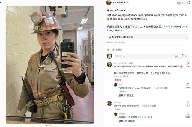 我希望我能懂中文,这样我就可以和网友们多交流。我也在评论区看到各地的地下工人分享他们工作时的图片给我。我还看到了不同国家、不同职业充满力量的女性们。