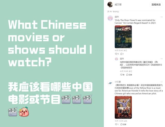 还有一次,我发帖问大家有什么好看的中国电影。评论区有44个人回复我。他们推荐了《黄河绝恋》《我不是药神》《河边的错误》《霸王别姬》......简直太多了,我会挑几部我感兴趣的看。