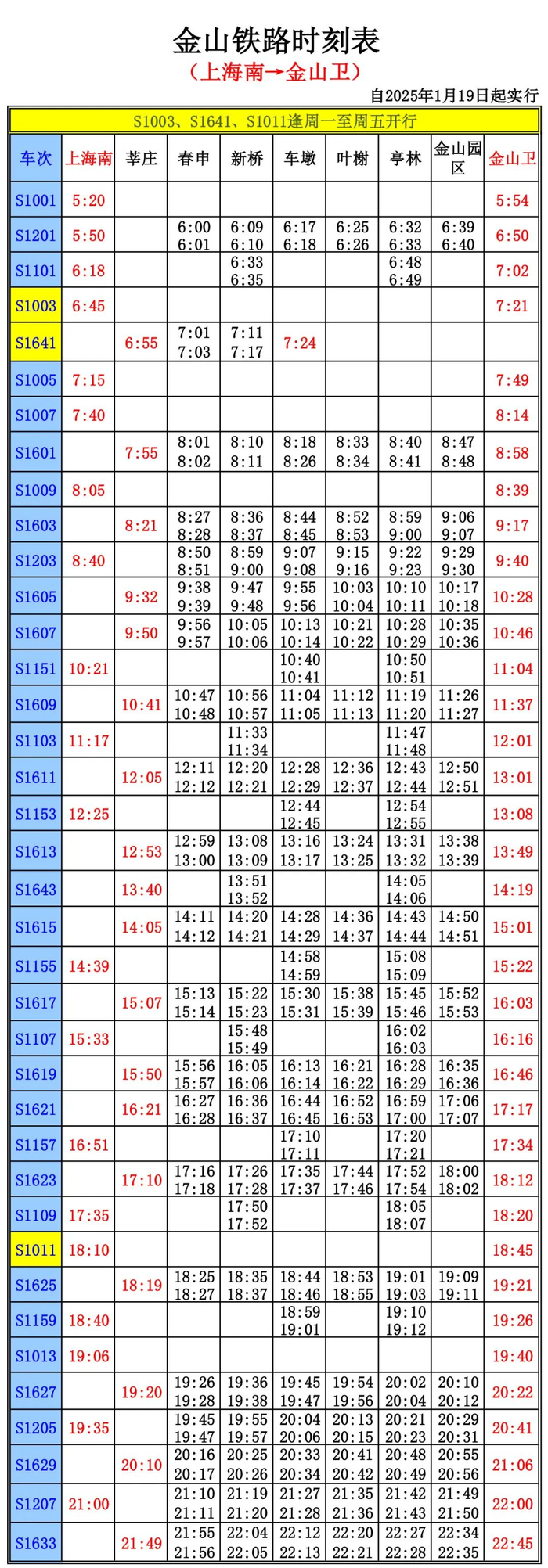 S1152次列车金山卫站始发时间为7:33(较目前提前7分钟),增加新桥、春申两个停站,进一步提高列车早通勤带客能力。原S1631次列车车次改为S1207次,始发站由莘庄站改为上海南站,发车时间调整为21:00。