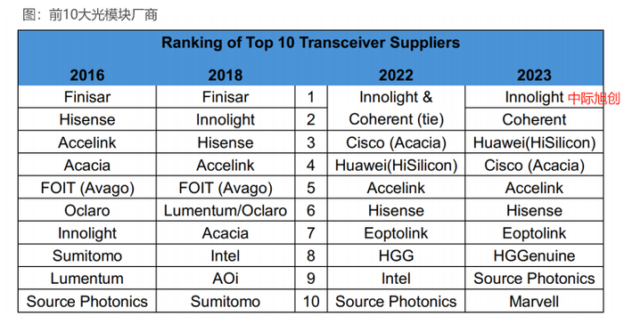 而且,在2022年的光模块厂商排名中,中际旭创还与Coherent并列全球第一。到了2023年,中际旭创直接超过Coherent,成功夺下全球第一的宝座。