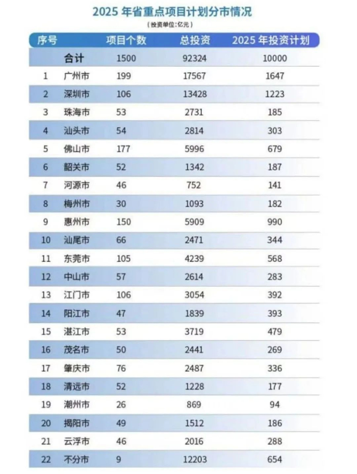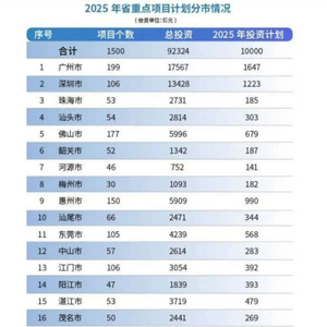省政府工作报告提出,2025年省重点项目建设工作将突出积极扩大有效投资和坚持发展实体经济两大重点,聚焦重点领域充分发挥投资关键作用,适度超前统筹推进基础设施建设、加快建设现代产业体系、加强民生保障,推动重大项目建设切实服务粤港澳大湾区建设、区域协调发展、科教兴国、制造业当家等重大战略。