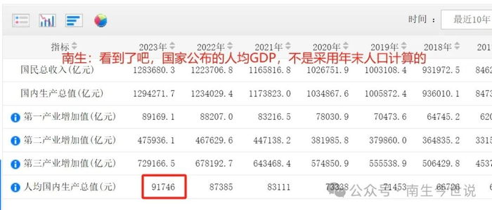 然后,再用2023年的GDP除以当年的年中人口,得到的人均GDP数值为91746元——大家可自行计算,仔细地验证一下,正好和国家统计局公开的数据库相吻合。