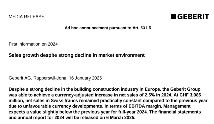 1月16日,吉博力发布2024年财务信息。2024年,吉博力销售额达到30.85亿瑞士法郎(约合人民币248.19亿元),略高于2023年的30.84亿瑞士法郎,同比增长0.03%,经7600万瑞士法郎的负面货币影响调整后,增长率为2.5%。增长原因除了上半年批发商库存重建外,主要由于市场地位的扩大和各种新产品的上市发售。虽然全年整体增长,但第四季度销售额下降了1.3%至6.85亿瑞士法郎,经货币调整后仍略有增长0.7%。