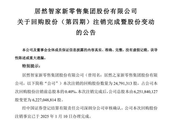 近日,居然智家发布关于回购股份(第四期)注销完成暨股份变动的公告。公告显示,居然智家新零售集团股份有限公司(曾用名:居然之家新零售集团股份有限公司)此次注销的回购股份数量为24,791,313股,占公司本次回购股份注销前总股本的0.40%,此次注销完成后,公司总股本由6,251,840,127股变更为6,227,048,814股。
