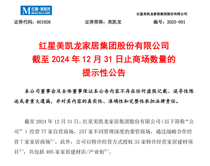 1月10日,红星美凯龙发布公告,截至2024年12月31日,公司经营77家自营商场和257家不同管理深度的委管商场。此外,通过战略合作经营7家家居商场,并以特许经营方式授权33家特许经营家居建材项目,合计包括405家家居建材店/产业街。