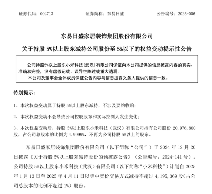 1月14日,东易日盛家居装饰集团股份有限公司公告,公司股东小米科技(武汉)有限公司(下称“小米科技”)于当日在深圳证券交易所交易系统通过集中竞价的方式减持公司无限售流通股2.32万股,占公司总股本的0.0055%。本次权益变动后,小米科技持有公司股份20,976,800股,占公司总股本的比例为4.9999%,持有公司股份比例降至5%以下,不再为公司持股5%以上的股东。