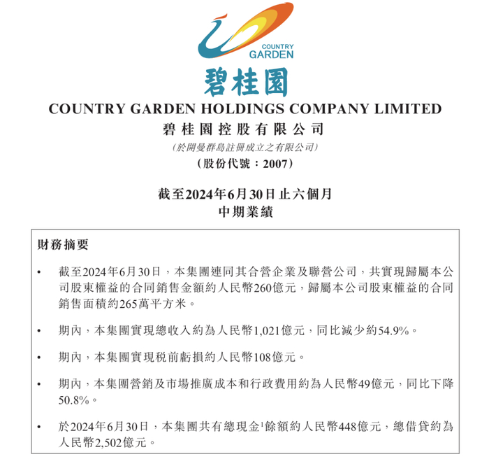 1月14日,碧桂园补发了2023年年报及2024年中报。据碧桂园2023年年报,截至2023年12月31日止,其实现归属公司股东权益的合同销售金额约1743亿元,权益销售面积2170万平方米。期内,碧桂园实现总收入4010亿元,同比减少6.8%;公司实现税前亏损约1673亿元。2024年半年报显示,截至2024年6月30日,碧桂园销售额260亿元。2024年上半年,碧桂园总收入约1021亿元,同比减少54.9%;期内,公司税前亏损约108亿元。截至2024年6月30日,碧桂园共有总现金余额约448亿元,总借贷约2502亿元。
