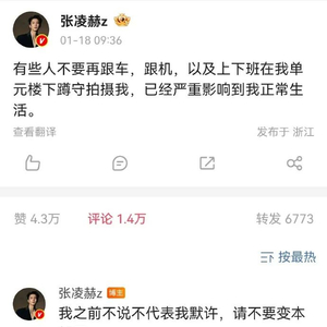 1月18日,演员张凌赫在社交媒体上发文喊话“私生饭”,呼吁众人理性追星。