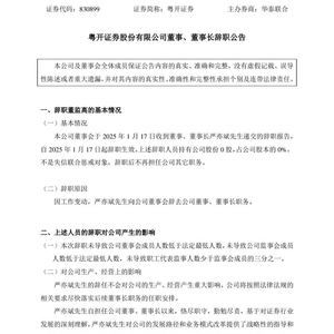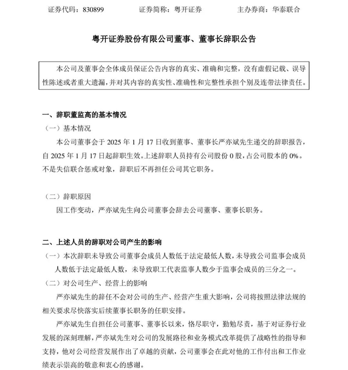 根据公告,粤开证券董事会于1月17日收到董事、董事长严亦斌递交的辞职报告。因工作变动,严亦斌向公司董事会辞去公司董事、董事长职务。自2025年1月17日起辞职生效。
