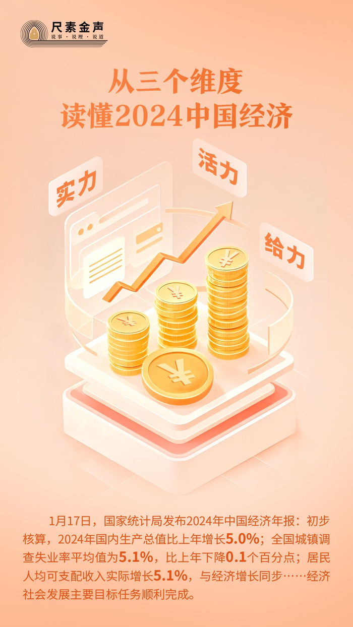 1月17日,国家统计局发布2024年中国经济年报:初步核算,2024年国内生产总值比上年增长5.0%;全国城镇调查失业率平均值为5.1%,比上年下降0.1个百分点;居民人均可支配收入实际增长5.1%,与经济增长同步……经济社会发展主要目标任务顺利完成。如何看待中国经济表现?读懂2024年中国经济年报,不妨从三个维度入手。