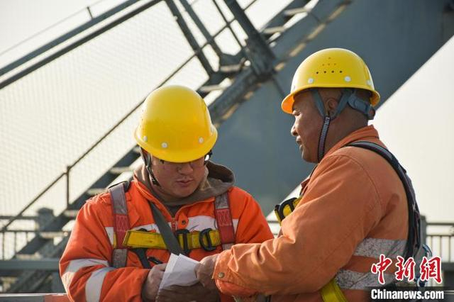 中新网九江1月18日电(巫发阳 王浩 陈果)“大家系好安全带,认真检查每个螺栓,看有没有松动、断裂。”1月17日,风和日丽的午后,中国铁路南昌局集团有限公司(简称“南铁”)九江桥工段九江大桥车间检查工区一行六人,乘坐工程车来到九江长江大桥,准备爬上距地面32米高的拱顶,对钢梁上的螺栓进行检查,保障春运通畅。