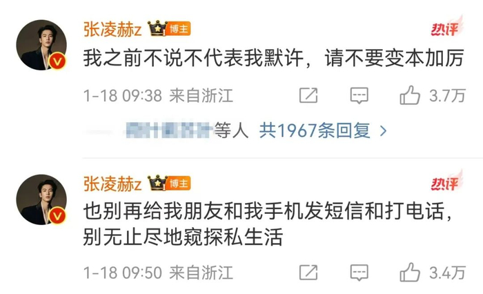 1月18日,艺人张凌赫在社交媒体上发文喊话“私生饭”,呼吁众人理性追星。