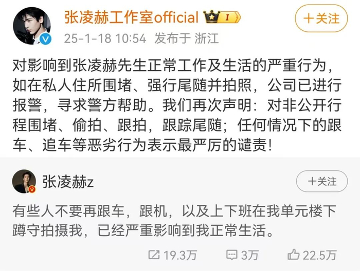 张凌赫工作室也转发该博文,并表示:“对影响到张凌赫先生正常工作及生活的严重行为,如在私人住所围堵、强行尾随并拍照,公司已进行报警,寻求警方帮助。我们再次声明:对非公开行程围堵、偷拍、跟拍,跟踪尾随;任何情况下的跟车、追车等恶劣行为表示最严厉的谴责!”