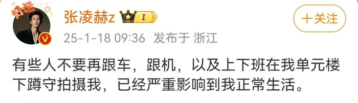 张凌赫写道:“有些人不要再跟车,跟机,以及上下班在我单元楼下蹲守拍摄我,已经严重影响到我正常生活。”