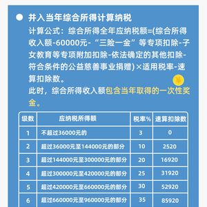 如果选择将全年一次性奖金并入当年综合所得:第一步,计算综合所得应纳税所得额。240000+36000-60000-24000-48000=144000元;第二步,查找适用税率。从综合所得年度税率表中,查找144000元对应税率为10%,速算扣除数为2520;第三步,计算综合所得全年应纳税额。144000×10%-2520=11880元。小张全年应缴个人所得税11880元。
