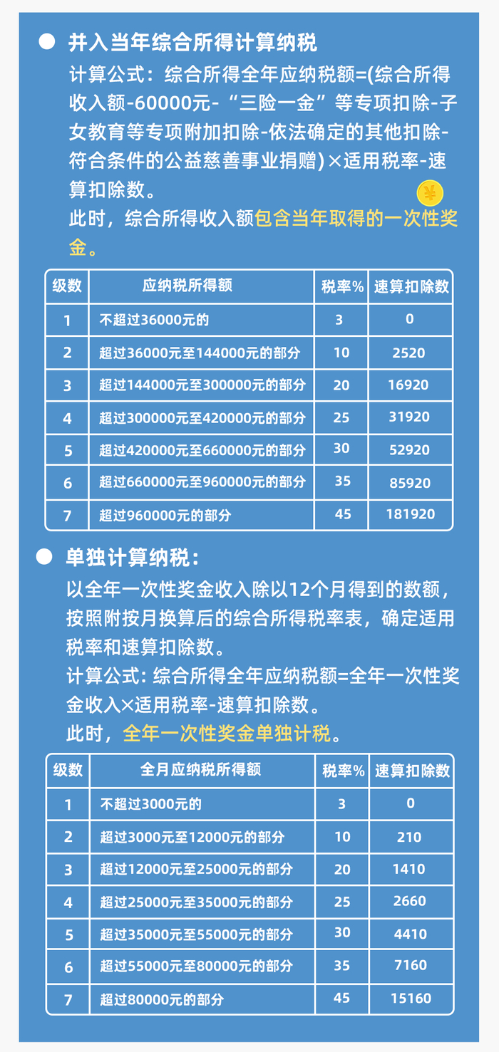春节将至,很多小伙伴都收到了年终奖。根据现行政策,居民个人取得的全年一次性奖金有两种计税方法可供选择。究竟哪种计税方法更划算呢?一起来看!