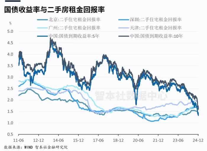 随着市场利率下降,金融资产整体收益率下降,与国债、存款(2%以内)的收益相比,租售比的优势逐渐显现,出于配置均衡与对冲风险的考量,部分长期资金将进入人口流入城市的租售比较高、且稳定的物业。