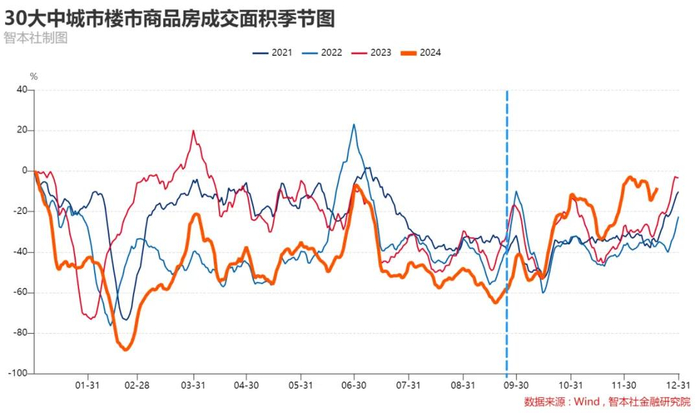 在“9·24”政策后,一线城市和大城市的成交量大涨,之前挤压的、被限制的刚需得以释放。下图展示的30大中城市商品房成交面积,政策出台后成交量明显高于往年。其中,二手房交易量上涨幅度更大。
