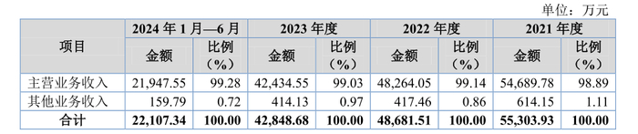 2021年-2024年上半年,荣鹏股份主营业务收入分别为5.47亿元、4.83亿元、4.24亿元及2.19亿元。公司2021年-2023年的主营业务收入逐年下滑。