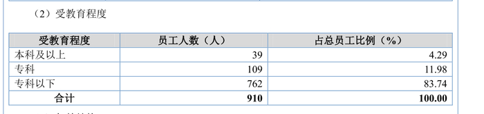 从整个公司来看,截至2024年6月末,荣鹏股份的员工为910 人,其中本科及以上学历的员工仅有39人,专科以下学历的员工达762人。