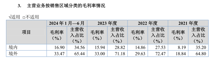 而分地区来看,荣鹏股份境外市场的毛利率要远超境内。2021年-2024年上半年,公司境外市场的毛利率分别为18.84%、29.63%、33.00%及33.47%,公司境内市场的毛利率则分别为8.19%、14.86%、15.94%及16.90%。