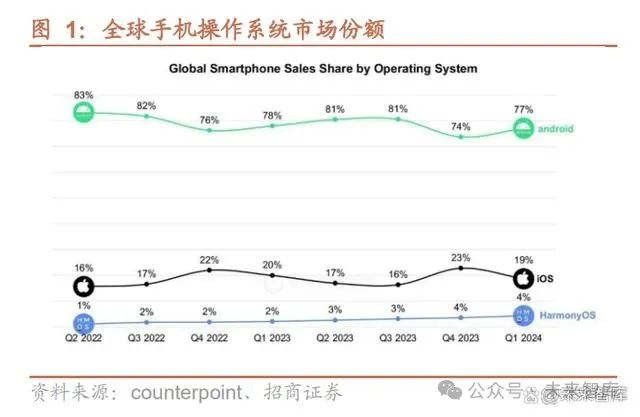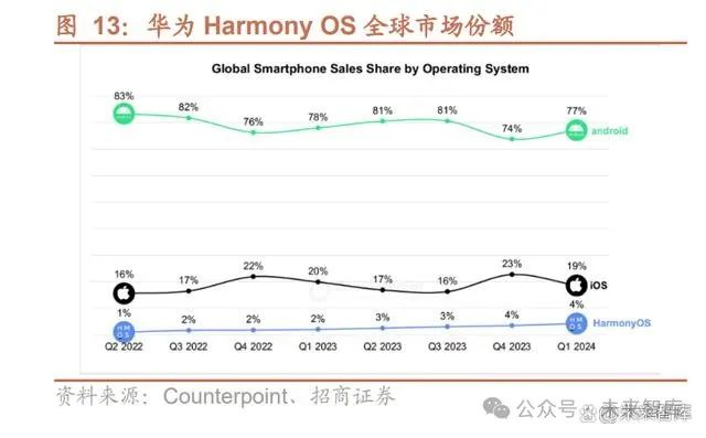 鸿蒙已跨越 16%操作系统“生死线”。据 IT 之家援引 Counterpoint 数据,在华为终端销量回归的背景下,2024 年 Q1,华为鸿蒙 HarmonyOS 在中国市场首次 超越苹果 iOS,成为我国第二大手机操作系统。据中国证券报,21 年 4 月时,华 为消费者业务AI 与智慧全场景业务部副总裁杨海松曾表示,16%的市场份额是 一条“生死线”,HarmonyOS 自 23Q3起份额即提升至 16%,成功跨越 16%操 作系统“生死线”,鸿蒙生态建设取得阶段性胜利。 HarmonyOS NEXT 较 Harmony4.0 性能进一步提升。根据华为开发者大会 HDC2024,HarmonyOS NEXT 采用全新分布式软总线,更强连接、更低功耗; 全新星盾安全架构,AI 隐私保护;HarmonyOS NEXT 整机性能相较 Harmony4.0 提升 30%,功耗降低 20%,超过芯片工艺制程提升两代带来的性能提升。