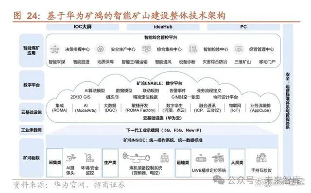 分行业看,鸿蒙落地千行百业,共促 OpenHarmony 生态繁荣: 各大金融机构积极接入鸿蒙系统。2021 年,中国银行、中信银行、广发银行接 入 HarmonyOS,其中,中国银行结合鸿蒙的功能特性,推出“中银外币现钞预 约”原子化服务,布局开放银行场景新生态;中信银行联合华为推出“中信银行” 原子化服务;广发银行推出适配鸿蒙系统的信用卡应用。2023 年,中国银联基 于 HarmonyOS NEXT 启动云闪付 APP 的鸿蒙原生应用开发,并在此基础上全 面展开银联支付网络生态应用的鸿蒙原生适配,与华为协力打造基于鸿蒙生态支 付基础设施。据华为官网“鸿蒙先锋”专栏,截止 2024 年 4 月,多家金融机构 的应用已接入鸿蒙系统,其中包括工商银行、农业银行、中国银行、建设银行、 交通银行、邮储银行 6 家国有大行,招商银行、平安银行、中信银行、兴业银行、 浦发银行、民生银行、光大银行、广发银行、华夏银行 9 家股份制银行,招商证 券、海通证券、平安证券、中信建投、平安证券等证券公司。 煤矿:设立华为矿鸿,开辟煤矿智能化建设新纪元。华为于 2021 年成立华为煤 矿军团,依托自身在 ICT 方面的领先优势,创造性地提出了“一网一云一平台” 地智能煤矿总体架构。在此基础上,华为携手国家能源神东煤炭集团于 2021 年 9 月 14 日发布“矿鸿操作系统”,标志鸿蒙操作系统在工业领域的首次商用。 截止 2023 年 5 月,矿鸿已在 10 余个煤矿部署,实现 3300 多套设备数字化管理 与运营。