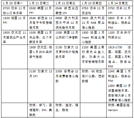 数据方面,未来一周值得关注的指标包括12月新屋销售、1月密歇根大学消费者信心指数。为纪念马丁·路德·金纪念日,美股将于周一(20日)休市。