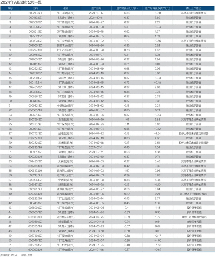根据Wind数据统计,2024年A股退市公司数量达到52家,创下历史新高。