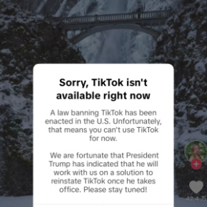 弹窗内容显示:美国已颁布禁止TikTok的法律,这意味着您暂时无法使用TikTok。候任总统特朗普已表示,他上任后将与我们一起研究恢复TikTok的解决方案。