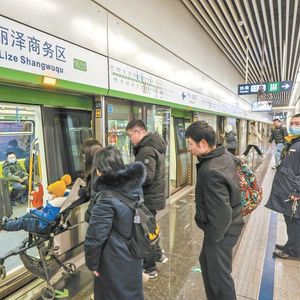 临近过年,地铁里提着行李的乘客逐渐增多。在新开通的16号线丽泽商务区站站台上,冯女士一家三口下了车,准备换乘14号线去北京南站,坐高铁回老家。