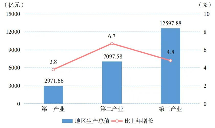 根据地区生产总值统一核算结果,2024年全省地区生产总值22667.12亿元,按不变价格计算,比上年增长5.3%。其中,第一产业增加值2971.66亿元,增长3.8%;第二产业增加值7097.58亿元,增长6.7%;第三产业增加值12597.88亿元,增长4.8%。