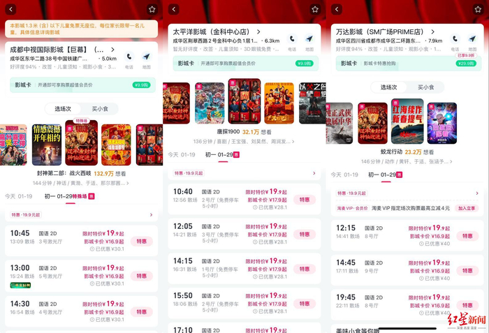 记者注意到,《封神第二部》《蛟龙行动》《唐探1900》等均出现了19.9元的票价。此前网上有消息称,今年春节档预售票补最低的能到6.9元,也有9.9元,这还有待后续影院和场次开放后验证。