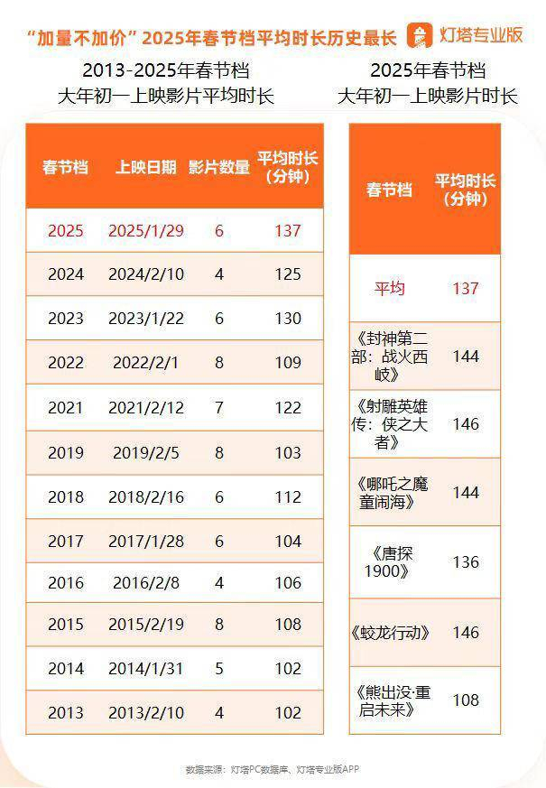 另外,2025春节档电影发行通知也已全部释出,六部影片的片长公布:《射雕英雄传:侠之大者》片长146分钟,《蛟龙行动》片长146分钟,《封神第二部:战火西岐》片长144分钟,《哪吒之魔童闹海》片长144分钟,《唐探1900》片长136分钟,《熊出没·重启未来》片长108分钟。