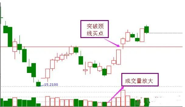 当大盘和个股经历了长时间的下跌之后,出现企稳的迹象,在K线图形上会形成双重底的形态,而右侧出现成交量放大,这个时候一旦突破颈线位置,就是我们大胆抄底的时候。