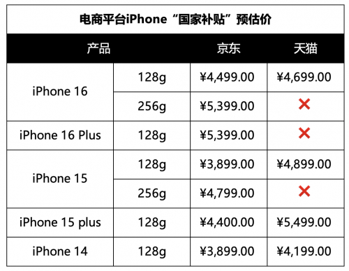 以128G的iPhone 16为例,京东价4999元,享受“国家补贴”15%优惠再减500元,最终到手价为4499元。天猫价5199元,使用国家补贴后的价格预估是4699元。