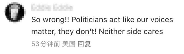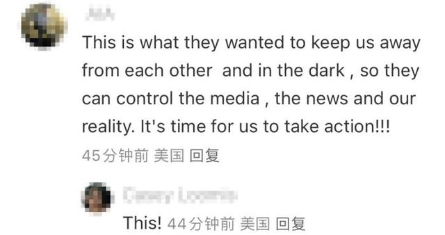 还有美国网友愤怒评价道,“(美国)政客们表现得好像我们的声音很重要,但他们没有这样做!都毫不在乎!”“这就是他们想要的,让我们远离彼此,处于黑暗之中,这样他们就可以控制媒体和我们的现实生活。是时候采取行动了!”