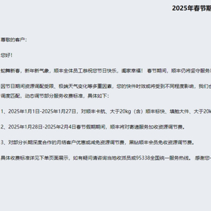 2025年1月28日-2025年2月4日春节假期期间,顺丰将对寄递服务加收资源调节费。