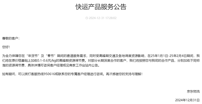 京东物流宣布将连续第13年“春节也送货”,全国范围以及全球多地消费者即使是在大年初一,也可以正常下单收货。为全力保障在“年货节”及“春节”期间的寄递服务需求,同时受高峰期交通及各地调度资源影响,在1月1日-2月4日期间,在原价格基础上加收0.1-0.6元/kg的高峰期资源调节费。